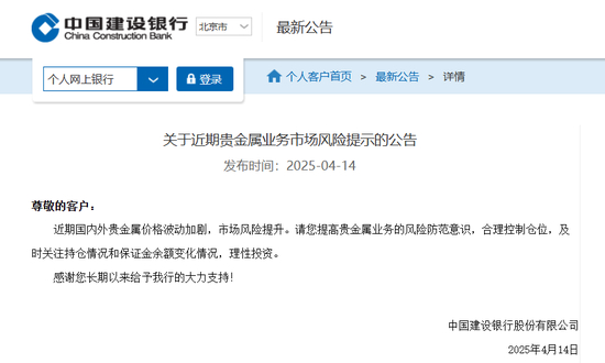 4月14日,建设银行在官网发布《关于近期贵金属业务市场风险提示的公告》称,近期国内外贵金属价格波动加剧,市场风险提升。请投资者提高贵金属业务的风险防范意识,合理控制仓位,及时关注持仓情况和保证金余额变化情况,理性投资。
