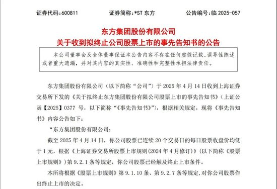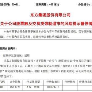 公告显示,*ST东方在4月14日收到上交所下发的《关于拟终止东方集团股份有限公司股票上市的事先告知书》(以下简称《事先告知书》)。