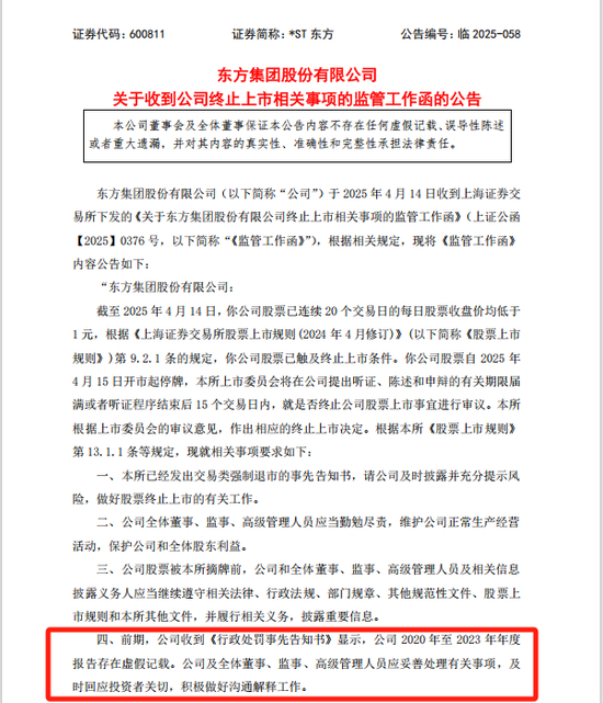 4月14日,*ST东方收到上交所下发的《关于东方集团股份有限公司终止上市相关事项的监管工作函》(以下简称《监管工作函》)。