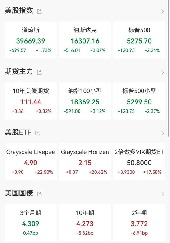 截至收盘,道琼斯工业平均指数下跌699.57点,跌幅1.73%,报39,669.39点;标准普尔500指数下跌2.24%,报5,275.70点;以科技股为主的纳斯达克综合指数下跌3.07%,报16,307.16点,已较此前高点下跌约19%,逼近技术性熊市门槛。