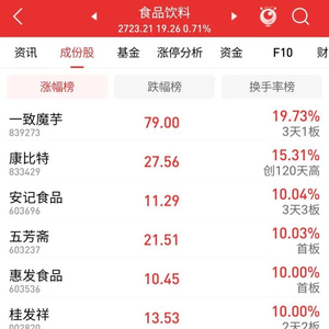 据通达信数据,截至4月17日收盘,食品饮料板块整体飘红,安记食品(股票代码:603696)、五芳斋(股票代码:603237)、惠发食品(股票代码:603536)等多只个股涨停,该板块中,一致魔芋(股票代码:839273)涨幅格外夺目,其股价收盘涨19.73%,报79元/股。