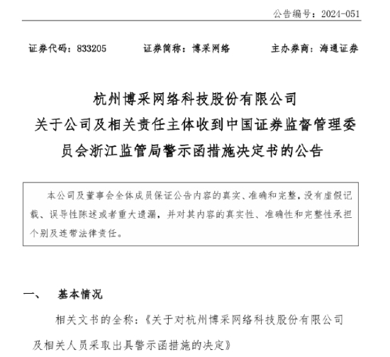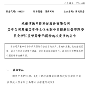 博采网络(833205)|新三板索赔胜诉+上市辅导终止+差错更正+警示函+杭州中院管辖