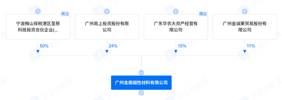 “企业预警通”显示,目前汪小明持有圣慈投资54%股权,而圣慈投资持有金南磁材50%股权;同时,汪小明还分别持有广州易上6.67%股份、金诚莱1.55%股份,广州易上和金诚莱则分别持有金南磁材24%股份和11%股份。
