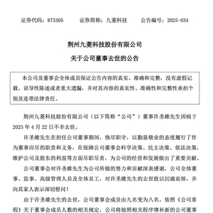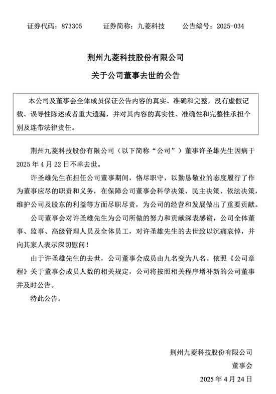 4月24日晚间,九菱科技发布公告称,公司董事许圣雄因病于2025年4月22日不幸去世。