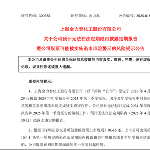 A股上市公司2024年年报披露即将收官,由于公司预计无法在法定期限内披露定期报告,金力泰(300225)正面临被实施退市风险警示(*ST)的风险。