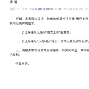 近年来,网络上屡次传出长江存储要借壳上市的消息。去年12月,公司在微信号上发布声明称,其从无任何“借壳上市”的意愿;并与万润科技等上市公司无直接业务合作。