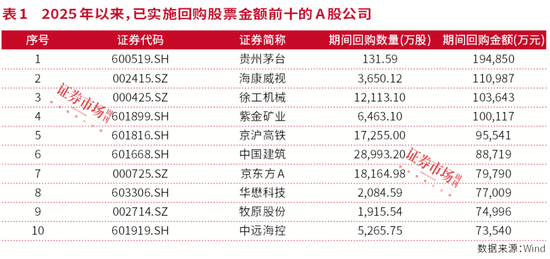 在具体个股回购金额上,据Wind数据显示,今年年初至4月23日,贵州茅台(已回购19.5亿元)、海康威视(已回购11.1亿元)、徐工机械(已回购10.3亿元)、紫金矿业(已回购10亿元)、京沪高铁(已回购9.5亿元)的回购金额排在了A股前五位置。