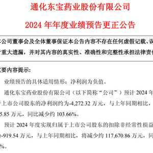 一个月后,通化东宝发布了2024年年度业绩修正公告。公告显示,经财务部门再次测算,预计2024年年度实现净利润约1164.21万元,同比减少约99%;预计扣非净利润约为2.64亿元,同比减少约77.43%。
