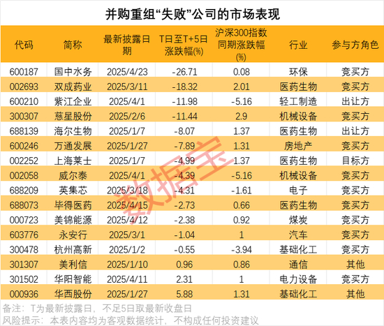 通常而言,上市公司并购重组“告吹”后,股价容易遭到重创。据数据宝统计,自T日至T+5日(T为最新披露日,若不足5日取截至最新收盘日),2025年最新披露并购重组失败的公司平均跌幅近6%,同期沪深300指数平均处于微跌状态。国中水务4月23日以来股价跌幅超过25%,同期沪深300指数微涨;双成药业3月11日至T+5日(3月18日)股价跌超18%。