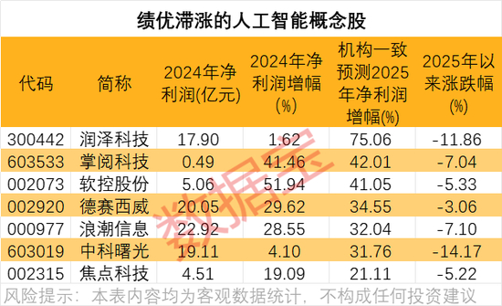 结合业绩来看,2024年实现盈利且同期增幅为正、机构一致预测2025年净利润增幅超过20%,截至4月25日,年内跑输同期行业指数(-3.01%)的人工智能概念股有7只,按照2024年净利润增幅排序,排名靠前的有软控股份、掌阅科技、德赛西威。
