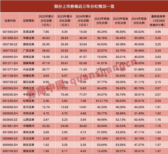 从股息率的角度来看,按4月28日最新收盘价计算,股息率达到3%以上的上市券商包括东吴证券、华泰证券、国信证券、广发证券。