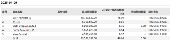 Wind数据显示,截至4月9日,科兴生物持股5%以上的大股东席位有SAIF Partners IV(赛富亚洲基金)、尹卫东、CDH Utopia Limited(鼎晖投资控制的公司)、Prime Success,L.P.(永恩国际有限合伙企业)、Vivo Capital(维梧资本)。