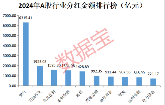 2024年,银行业再度成为王者,行业分红总额为6315.41亿元,遥遥领先于其他行业;另外石油石化、食品饮料、非银金融、通信等行业分红额均超千亿元。