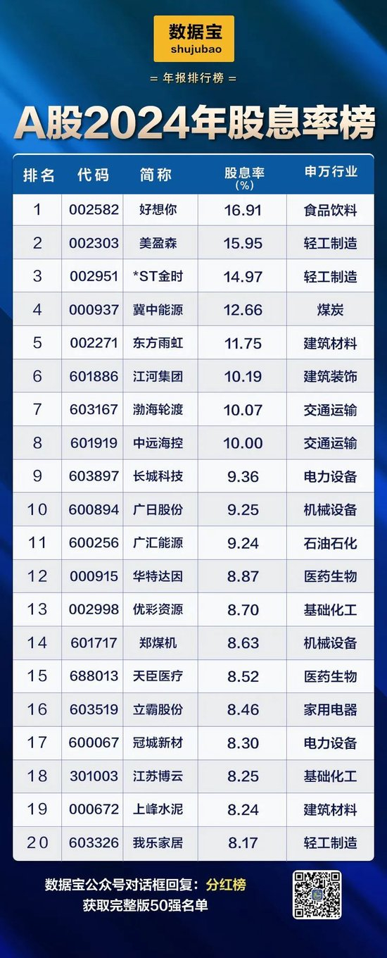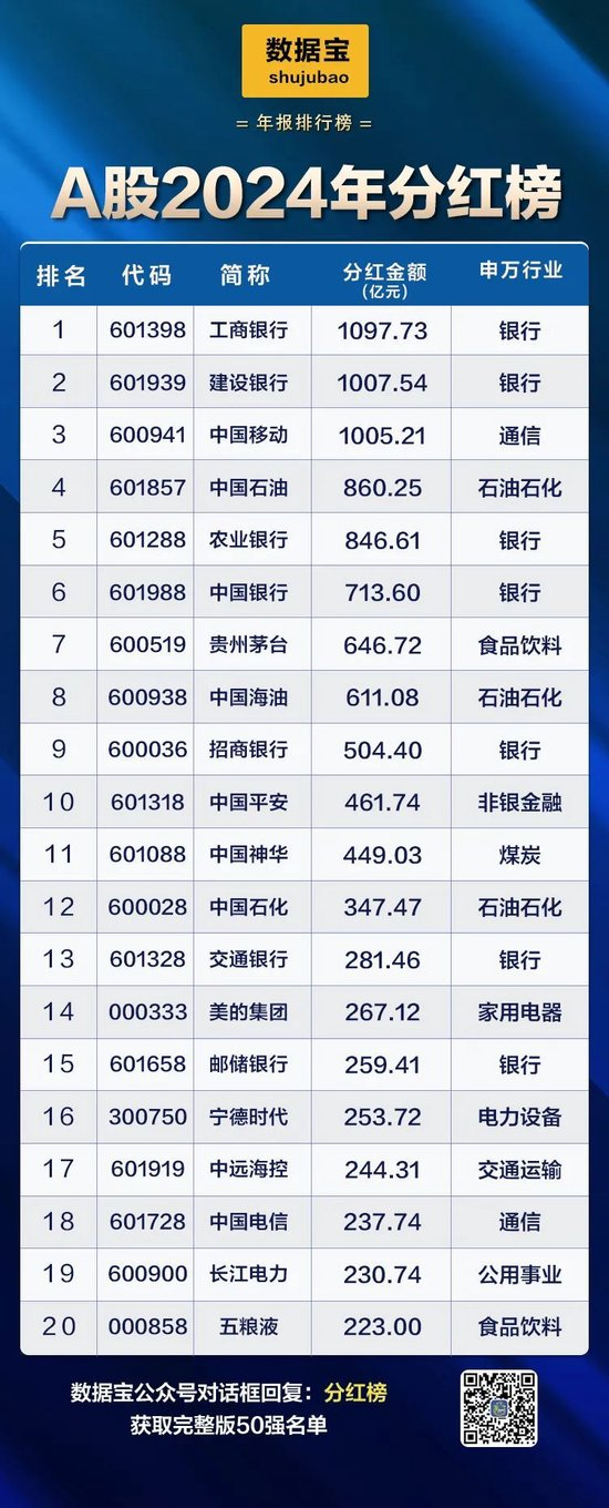 站在当前市场环境下,高分红、高回报的公司也日渐成为投资者关注的焦点。据此,数据宝制作了《A股2024年分红榜》和《A股2024年股息率榜》。同时,能够长期保持高分红、高回报的公司更加值得重点关注,它们的股价表现往往也更为优异。