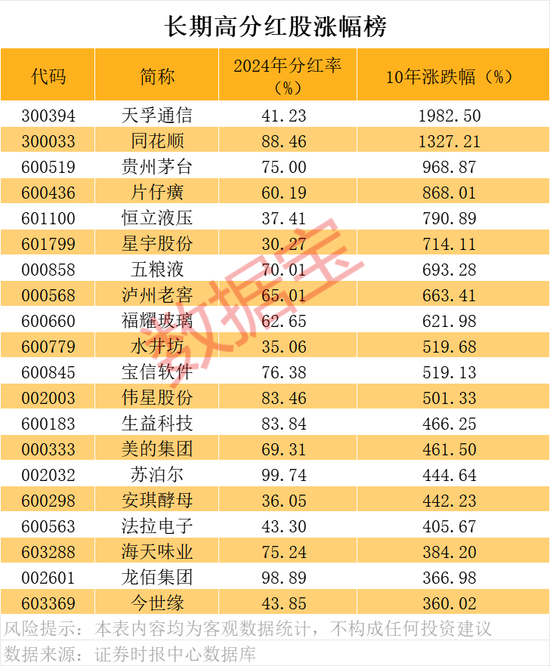从股价表现来看,2015年至2024年底这10年间,上述连年高分红公司股价平均涨幅接近120%,85家公司股价翻倍,占比超过36%。其中,天孚通信和同花顺大涨逾13倍,贵州茅台、片仔癀、恒立液压、星宇股份等10家公司涨超5倍。
