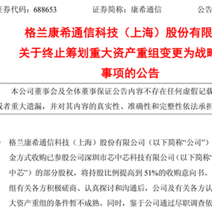 5月6日晚间,康希通信发布公告称,前期拟收购深圳市芯中芯科技有限公司(以下简称芯中芯)部分股权至持股51%的重组计划终止,因短期内实施重大资产重组的条件暂不成熟,现以1.35亿元受让芯中芯35%股份,实现合计持有其37.77%的股份。