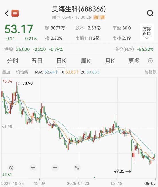 截至5月7日收盘,昊海生科报53.17元/股,总市值为112亿元。