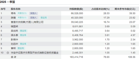 截至2025年一季度末,蒋伟的持股数量为6652.8万股,持股占比为28.53%,期末参考市值为39.3亿元。