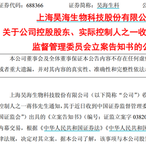 5月7日,昊海生科发布公告称,公司控股股东、实际控制人之一蒋伟近日收到中国证券监督管理委员会出具的《立案告知书》,因涉嫌内幕交易,根据《中华人民共和国证券法》《中华人民共和国行政处罚法》等法律法规,决定对其立案。