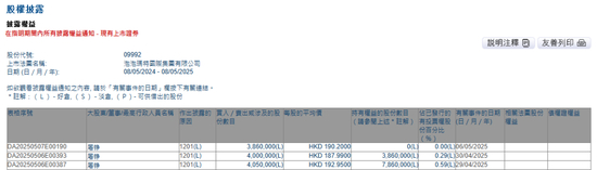 红星资本局注意到,港交所股权披露数据显示,4月29日,作为泡泡玛特董事的屠铮以每股均价192.95港元减持405万股;4月30日,屠铮又以每股均价187.99港元减持400万股;5月6日,他又以190.20港元/股的价格抛售386万股,完成清仓。据计算,三轮减持累计套现22.68亿元(约合人民币21.17亿元)。