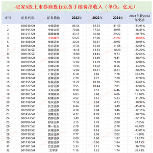 近期,42家纯证券业务A股上市券商年报披露完毕。2024年,42家券商投资银行业务手续费净收入合计306.08亿元,同比下降27.4%。