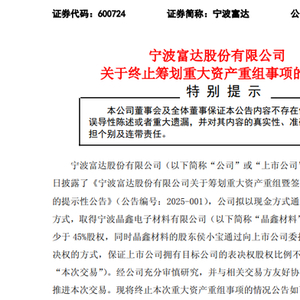 在5月9日公告中,谈及终止本次重组事项影响,宁波富达阐述,本次交易尚处于筹划阶段,截至公告披露之日,交易各方未就具体方案最终达成实质性协议。终止本次重大资产重组不会对公司现有生产经营活动、财务状况和战略发展造成重大不利影响,不存在损害公司及全体股东尤其是中小股东利益的情形。