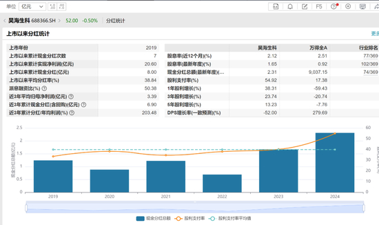 然而,2024年,昊海生科扔抛出A股上市以来最高分红计划——2.31亿元,占当期归母净利润的54.92%。据Wind数据,截至2024年,蒋伟、游捷夫妇持有昊海生科的股权约46%。按此计算,蒋伟夫妇分红金额约1.06亿元。
