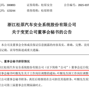 5月12日晚间,松原安全公告变更公司董事会秘书,公司原董秘叶醒先生因工作岗位调整不再担任公司董事会秘书职务,离任后将继续在公司担任其他职务,公司聘任张毕峰先生为公司董秘。