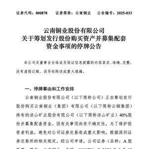 云南铜业表示,因有关事项尚存不确定性,为了维护投资者利益,避免对公司证券交易造成重大影响,根据深圳证券交易所的相关规定,经公司申请,公司证券自2025年5月13日开市起停牌。