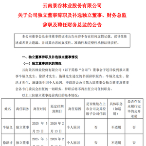 今年2月,ST景谷完成董事会换届选举,牛炳义、徐洪才、施谦均获得续聘,任期到期日为2028年2月13日。