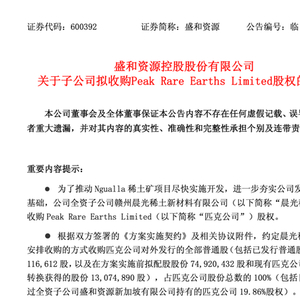 公告显示,为了推动Ngualla稀土矿项目尽快实施开发,进一步夯实公司发展的资源基础,盛和资源全资子公司赣州晨光稀土新材料有限公司拟收购Peak Rare Earths Limited(匹克公司)100%股权。