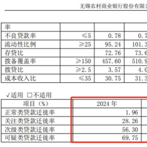 不过,作为衡量银行资产质量变化的贷款迁徙率指标,2024年,无锡银行的贷款迁徙率全面攀升。正常类贷款迁徙率从1.28%升至1.96%,关注类贷款迁徙率从10.62%跃升至28.26%,次级类和可疑类贷款迁徙率更分别攀升至56.30%和69.75%。