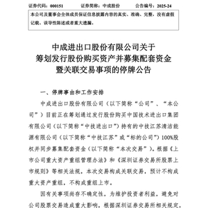 5月15日晚,中成股份发布公告,拟通过发行股份购买中国技术进出口集团有限公司(简称“中技进出口”)持有的中技江苏清洁能源有限公司(简称“中技江苏”)100%股权,并同步募集配套资金。