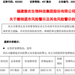 *ST傲农表示,公司已于4月29日向上交所提交关于撤销对公司股票实施退市风险警示及其他风险警示的申请,上交所于5月16日同意公司撤销退市风险警示及其他风险警示。