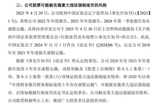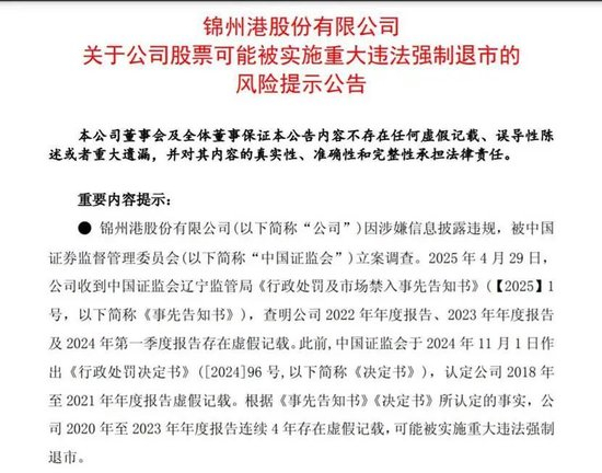 近日,锦州港股份有限公司(以下简称“锦州港”)发布《关于公司股票可能被实施重大违法强制退市的风险提示公告》,可能被实施重大违法强制退市。