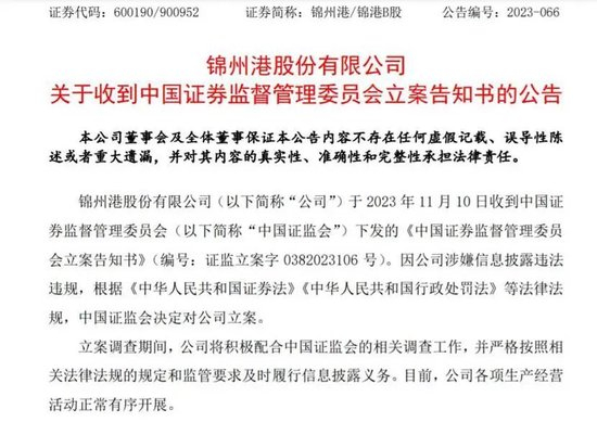 2024年4月22日,证监会下发的《行政处罚及市场禁入事先告知书显示》显示,锦州港为做大收入和利润,满足银行贷款需求,锦州港与大连和境贸易有限公司、上海银鸿国际贸易有限公司、宁波朗逸能源有限公司、宁波百荣能源有限公司、重庆岳城川聚贸易有限公司、上海盛辙国际贸易有限公司、舟山丰聚益尚能源有限公司共七家公司开展无商业实质的大宗贸易业务。
