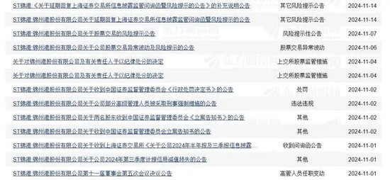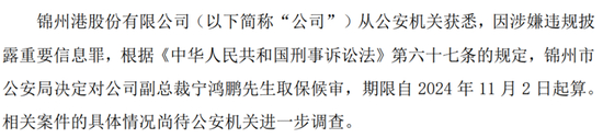 2024年11月2日,证监会对锦州港时任董事长徐健和时任副董事长、总经理刘辉、时任董事鲍晨钦、时任财务总监李挺、时任副总经理宁鸿鹏、时任副总经理曹成给予处罚。
