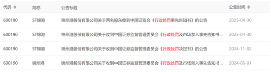 2025年4月29日,因虚假财务记载,时任副董事长、总经理刘辉决策、组织实施虚假贸易、对跨期确认收入问题未尽到应有管理义务,时任副总经理、财务总监李挺参与虚假贸易、对跨期确认收入问题未尽到应有管理义务,董事长尹世辉未审慎关注锦州港存在虚假贸易、对跨期确认收入问题未尽到应有管理义务,时任副总经理张文博分管贸易业务,未审慎关注锦州港存在虚假贸易。涉嫌信息披露违法违规案,经调查完毕,依法作出行政处罚。