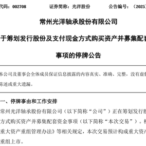5月18日晚间,光洋股份(002708)发布公告称,公司正在筹划发行股份及支付现金方式购买资产并募集配套资金事项(简称“本次交易”)。根据《上市公司重大资产重组管理办法》等相关规定,本次交易预计构成重大资产重组,不构成重组上市。