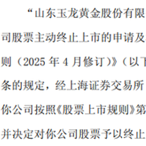 5月20日,玉龙股份(601028)公告称,公司收到上交所作出的《关于山东玉龙黄金股份有限公司股票终止上市的决定》,决定终止公司股票上市。公司股票将于5月27日终止上市暨摘牌,不进入退市整理期交易。