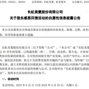 另外,2025年5月23日至25日期间,股东也可前往“长虹美菱股东感恩回馈活动”现场(合肥市经开区莲花路与卧云路交口美菱公寓)进行了解或购买。