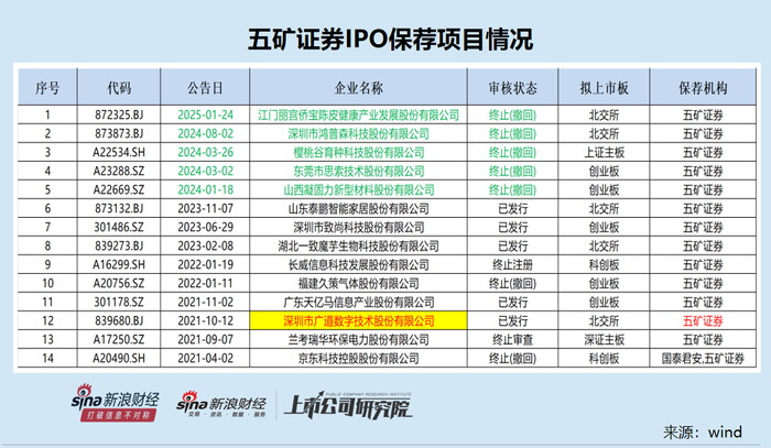 wind显示,2021年11月,五矿证券历史上保荐的首家IPO企业——*ST 广道成功在北交所上市,募资2.05亿元。根据《北交所股票上市规则》的规定,“公开发行并上市的,持续督导期间为股票上市当年剩余时间及其后3个完整会计年度”。2021年11月15日及以后、2022年度、2023年度和2024年度属于五矿证券的持续督导期间。