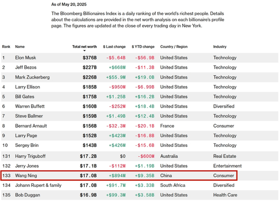 据彭博亿万富豪实时排行榜显示,截至5月20日,作为泡泡玛特创始人、CEO和第一大股东的王宁,身家单日增长8.84亿美元至170亿美元,在全球排第133位。