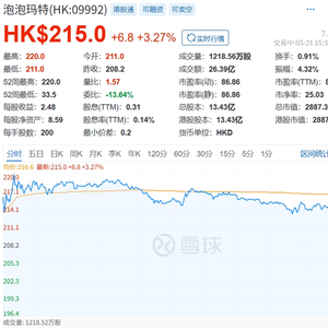 今天上午,泡泡玛特(9992.HK)股价盘中再度劲升,最高触及220港元,续创历史新高,市值逼近3000亿港元。