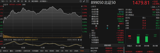 不过,同样是成长主线,北证50继续创新高。今日北证50一度突破1500点大关,收盘时有所回落,以1479.81点报收,涨幅为0.39%。