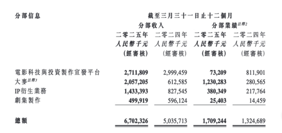 从业务结构来看,阿里影业已形成四大核心板块:电影科技与投资制作宣发平台业务、大麦、IP衍生、剧集制作。其中,电影科技与投资制作宣发平台业务涵盖电影票务、电影投资制作及宣发以及科技业务,是阿里影业的核心业务(2025财年占公司总营收40.46%)。报告期内,在电影票房与观影人次双双下滑的市场环境下,该业务面临较大的压力,数据显示,该板块收入同比减少约9.61%至27.12亿元,分部业绩同比减少约91%至7321万元。