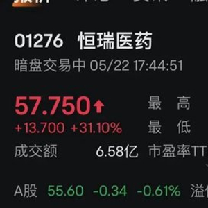 恒瑞医药(01276)港股明日上市,今日富途暗盘价格不负投资者期待,开盘价为每股49港元,上涨11.24%,此后继续上涨,截至发稿价格为57.75港元,涨幅为30%。
