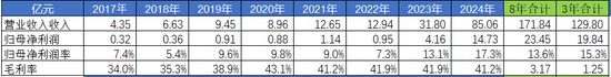 老铺黄金的核心盈收数据见上表。有我们已经知道的,2024年营业收入85亿,归母净利润14.73亿,归母净利润率17.3%,毛利率41.2%。