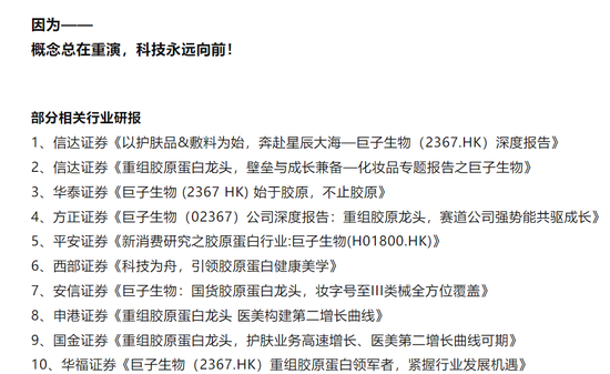 此外,华熙生物还在文章末尾列出信达证券、平安证券、方正证券、国金证券等9家针对医美行业和巨子生物的券商报告。