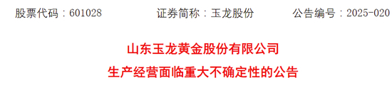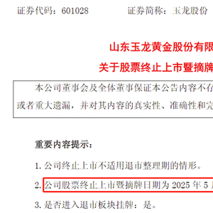 2025年5月20日,玉龙股份收到上海证券交易所作出的《关于山东玉龙黄金股份有限公司股票终止上市的决定》,上交所决定终止公司股票上市。公司股票不进入退市整理期交易,上交所将在公告公司股票终止上市决定之日起5个交易日内,对公司股票予以摘牌、终止上市。